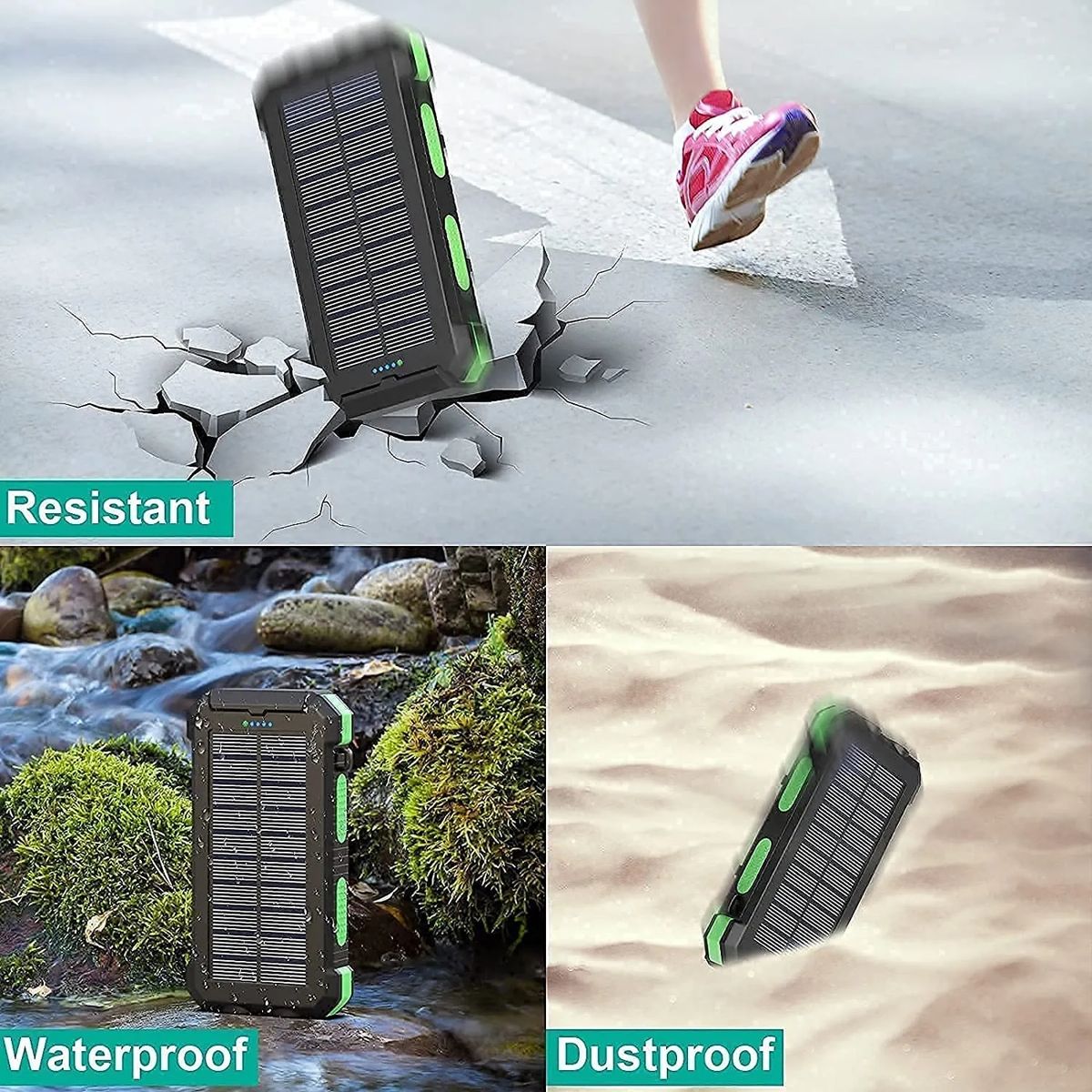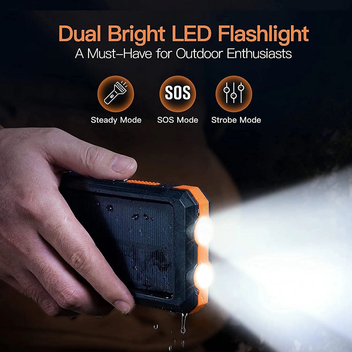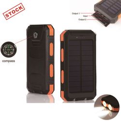 1. Outdoor solar charger: water-resistant shock-resistant and dust proof solar phone charger, equipped with compass and 2LED flashlight. Perfect for outside activity as camping travel hiking constructions and many other emergency use. 2. Dual USB covered by the side: universal 5V/1A and 5V/2. 1A outputs. 3. Superior portable design: made of durable and reliable material ABS+PC+Silicone. 4. Powerful LED light: 2led lights can be used as flashlight with Stand by-SOS-Strobe mode. 5. External battery charger with solar panel can recharge by solar or outlet. But please do not take solar as main power source as it mainly for topping off. Stock in US warehouse,5-7 days fast shipping!!!
